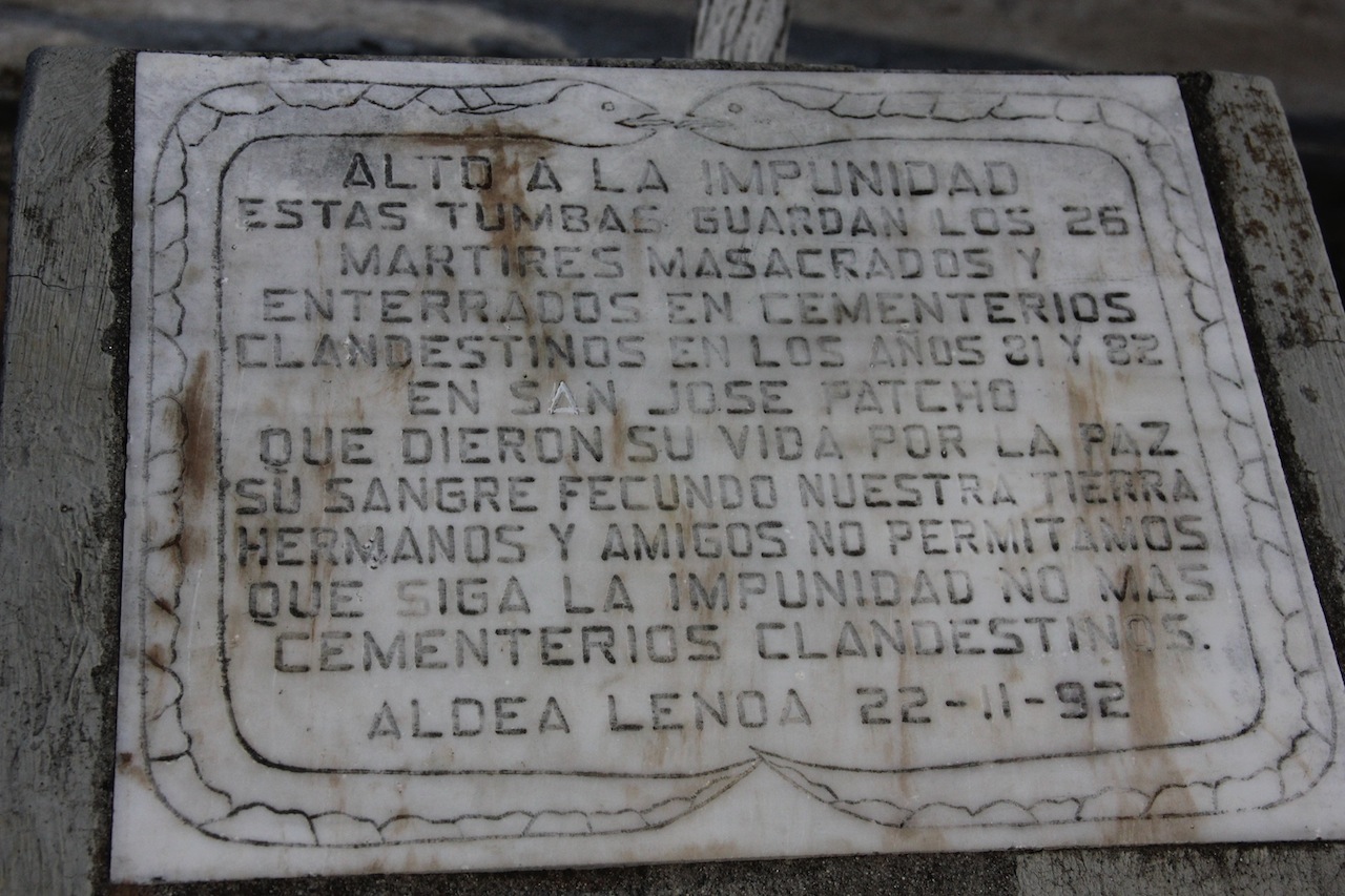 “Alto a la impunidad – Estas tumbas guardan los 26 mártires masacrados y enterrados en cementerios clandestinos en los años 81 y 82 en San José Pachó que dieron su vida por la paz. Su sangre fecunda nuestra tierra. Hermanos y amigos no permitimos que siga la impunidad, no más cementerios clandestinos. Aldea Lemoa 22-11-92”