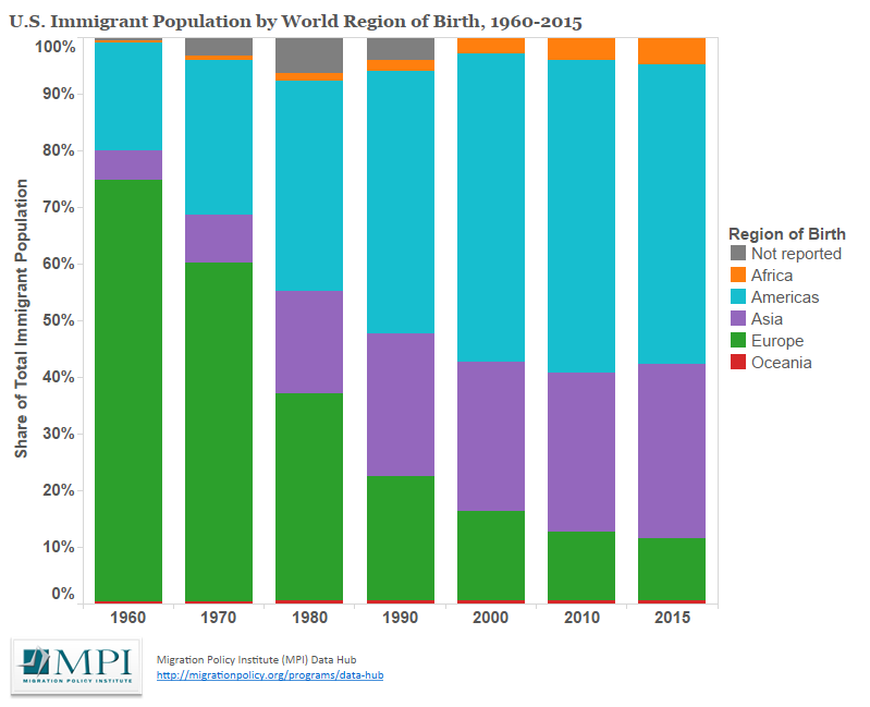 Población inmigrante de Estados Unidos por región de origen, 1960 – 2015. Fuente: Migration Policy Institute.