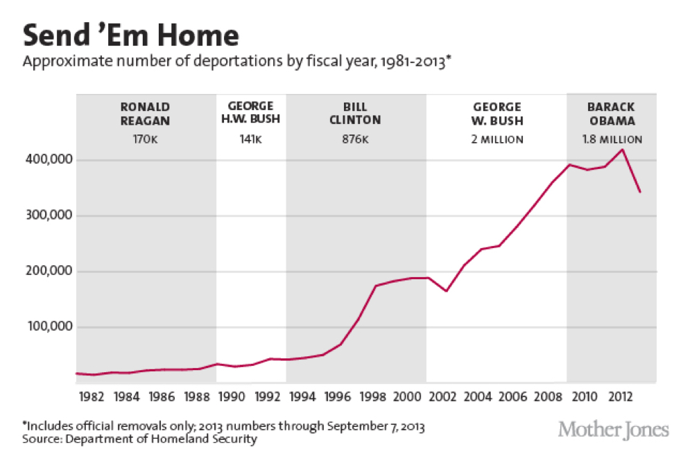 En 1996, una década después, el presidente Bill Clinton firmó la Ley de Reforma de Inmigración Ilegal, que sentó las bases para la maquinaria de deportación masiva existente hoy día. Millones de inmigrantes, incluso los residentes legales, se volvieron sujetos de deportación por delitos menores, no violentos, como sustraer artículos de una tienda, poseer marihuana o saltarse el torniquete de entrada al metro. El simple hecho de haber cruzado la frontera indocumentados se convirtió en justificación para expulsarlos (o repatriarlos). La ley también hizo muy difícil que los inmigrantes indocumentados pudieran legalizar su situación, incluso si su cónyuge era estadounidense o si tenían hijos nacidos en Estados Unidos. La posibilidad de deportación se convirtió en una amenaza casi constante.
